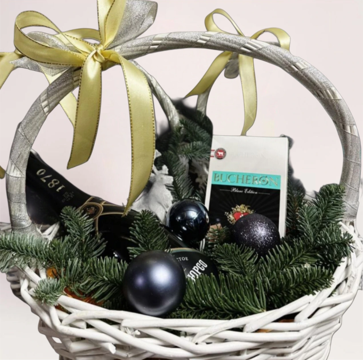 Новогодняя корзина Black Gold Basket — элегантная подарочная композиция в светлой плетеной корзине с игристым вином, темным шоколадом, хвойными ветками и праздничным декором. На фото корзина выглядит сдержанно и дорого. Черные матовые и глянцевые шары, густо выложенная хвоя, бутылка игристого и плитка шоколада Bucheron формируют образ зимней классики с акцентом на стиль. Золотая лента на ручке добавляет благородство и делает композицию завершенной без лишних деталей. Такой подарок выглядит статусно и уместно для особого поздравления. Вы можете купить Black Gold Basket с бесплатной доставкой. Мы принимаем заказы онлайн или по телефону без выходных.
