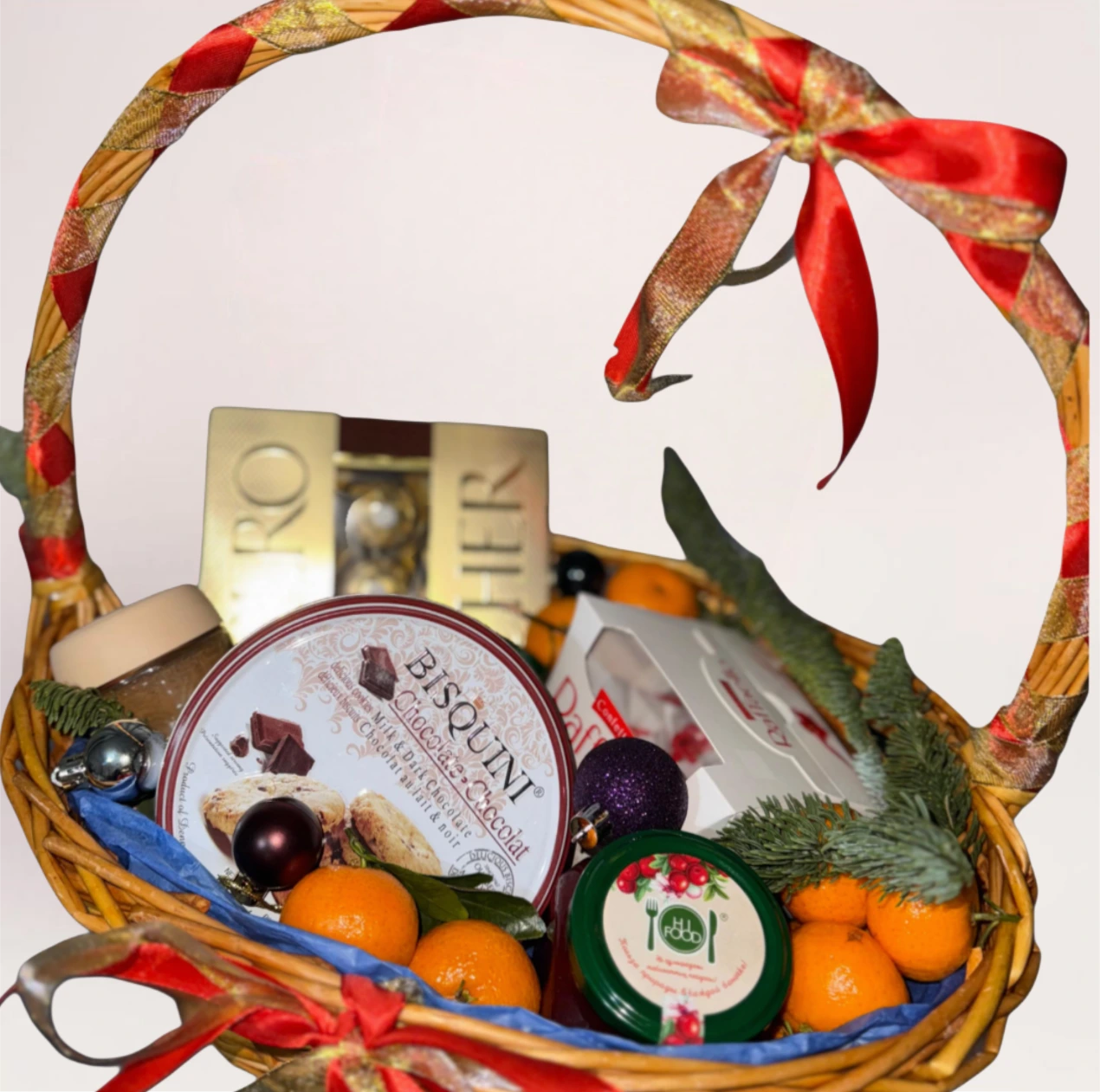 Плетеная корзина содержит в себе яркие мандарины с насыщенным ароматом, который традиционно ассоциируется с Новым годом. Отборные сладости и декоративные элементы усиливают впечатление от подарка и делают его более выразительным. Хвойные ветки подчеркивают зимний характер композиции, а ленты в теплых оттенках завершают образ и создают визуальный баланс. Надежная фиксация деталей позволяет корзине сохранять презентабельный вид при транспортировке и полностью соответствовать фото перед отправкой.