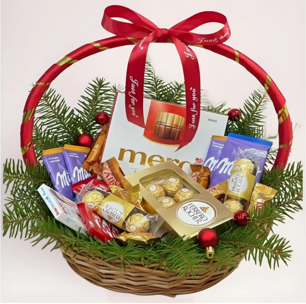 Новогодняя подарочная корзина «Golden Sweet» — праздничный сладкий подарок, оформленный с использованием хвои нобилис, ёлочных шаров и новогоднего декора. В корзине собраны популярные сладости и шоколад, аккуратно размещённые в плетёной корзине с яркой праздничной лентой.