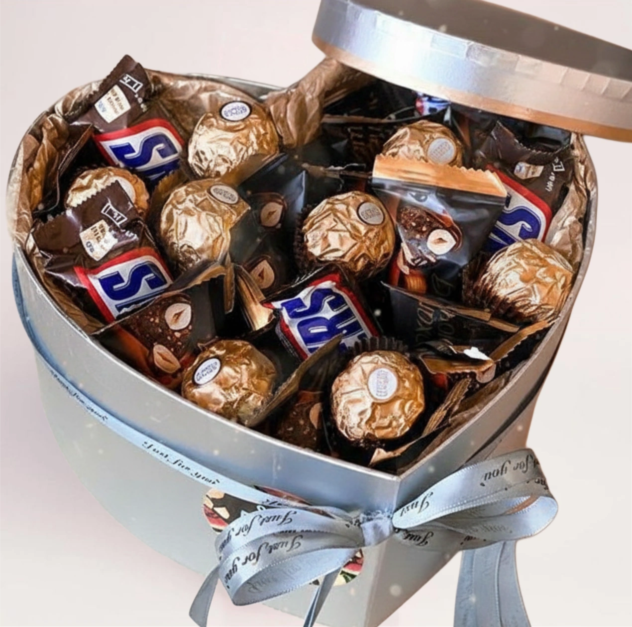 Сладкий подарочный набор с бесплатной доставкой по городу — круглая коробка с батончиками Snickers и конфетами Ferrero Rocher, аккуратно собранная и готовая к вручению. Контраст шоколада и ореховых конфет делает набор универсальным и понятным для любого повода.