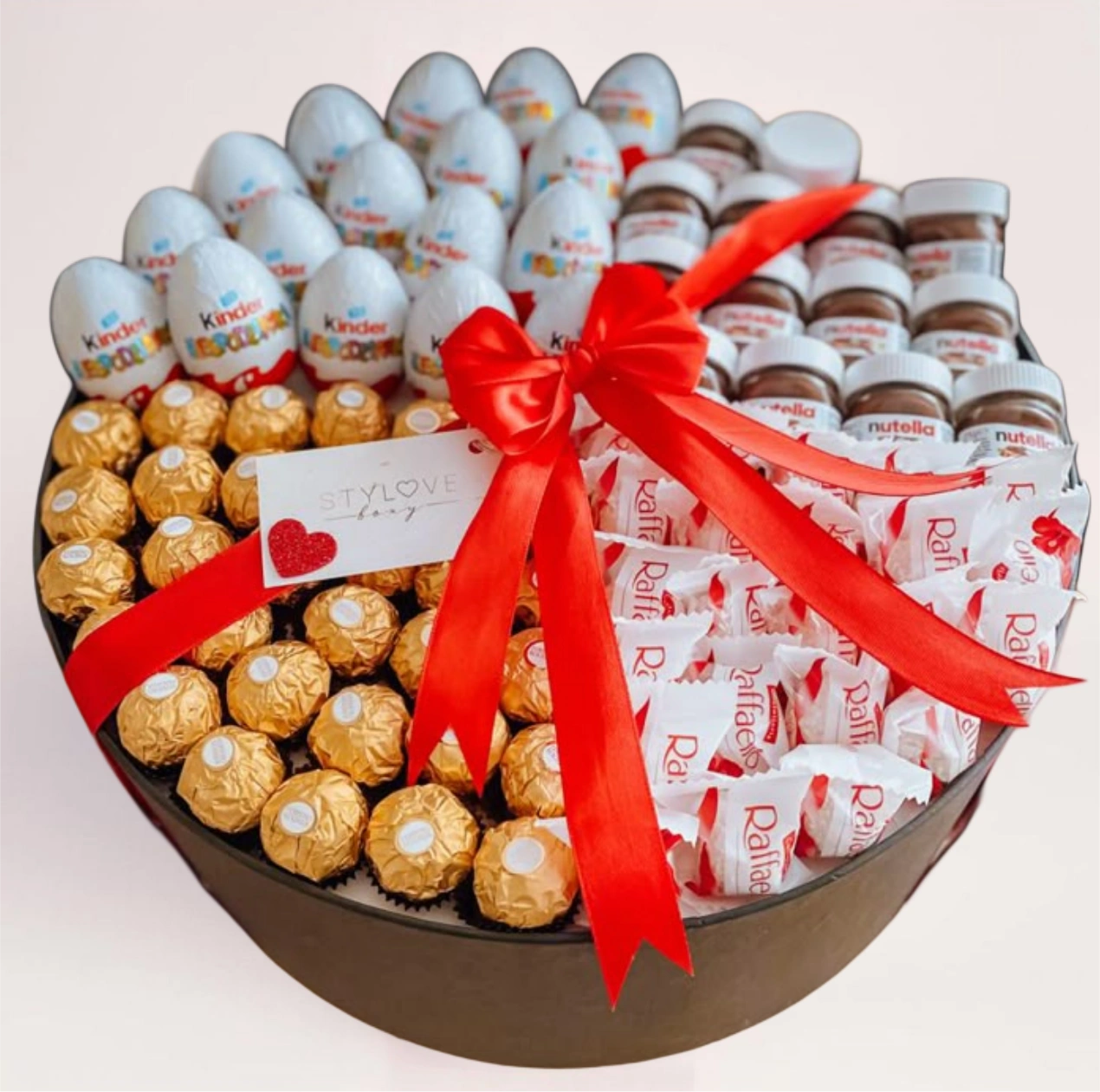 Большой сладкий подарочный набор с Ferrero Rocher, Kinder Surprise, Raffaello и Nutella — готовый подарок и эффектное дополнение к цветам с бесплатной доставкой.
